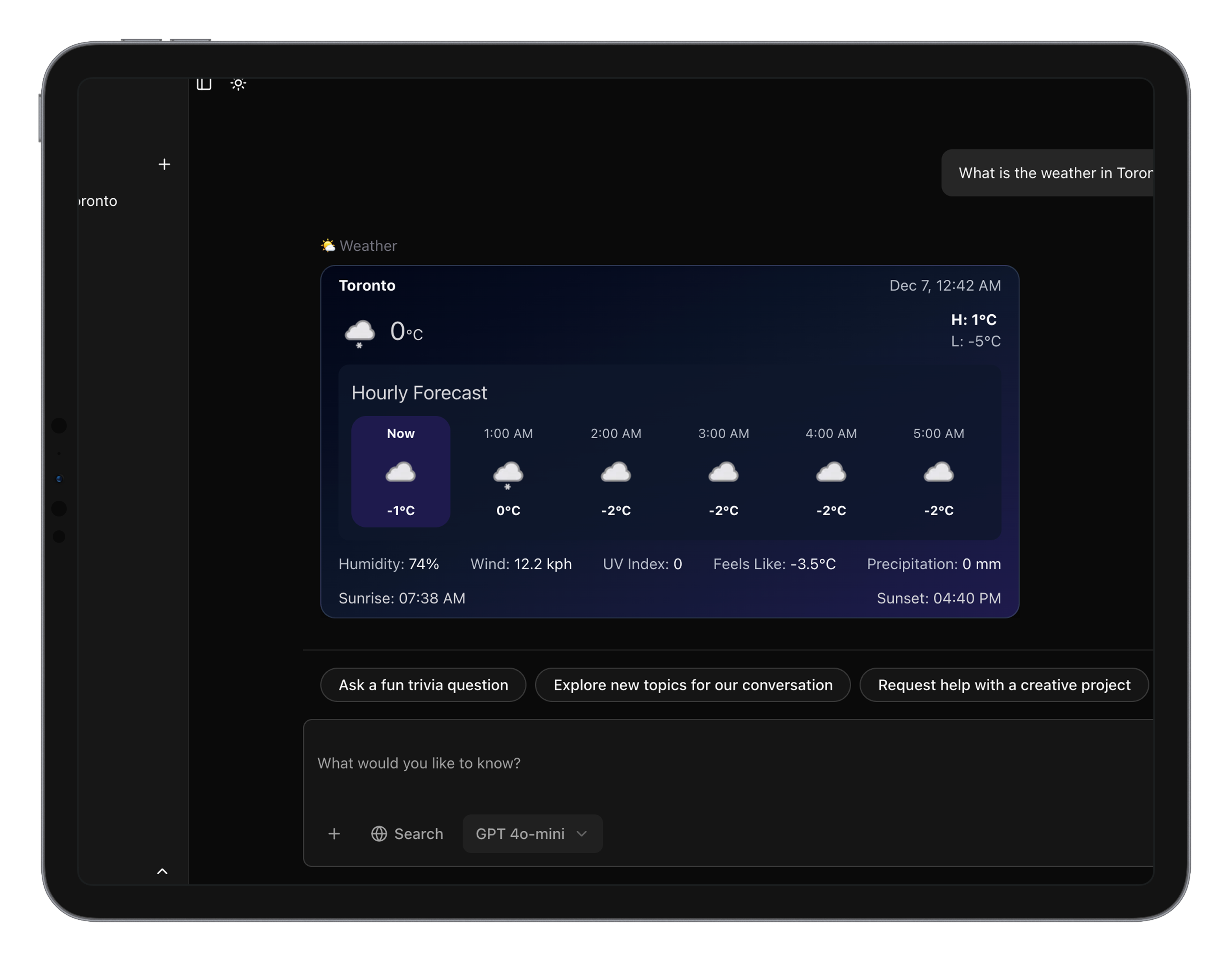 An AI-powered chatbot web app built with Next.js, TypeScript, TailwindCSS, and PostgreSQL. It can answer questions, perform web searches, and features a modern weather-card style UI for real-time information. View Project